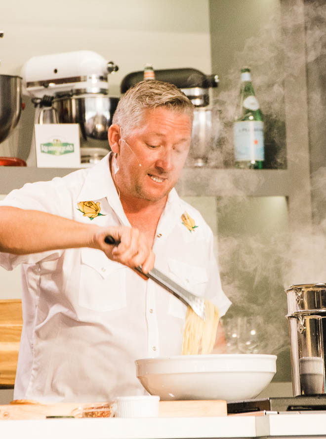 Yes, the chef behind the meat-centric restaurants, Lonesome Dove Western Bistro, Woodshed Smokehouse, Queenie’s Steakhouse and White Elephant Saloon, was inspired by a recent trip to Italy and “scrapped all the shit” he was going to do in order to demonstrate Spaghetti alle Zucchine, a dish that sounds so good, I cannot wait to try at home. Chef Love served the dish with Bistecca alla Fiorentina and, as is his tradition, ended the class with the lively tequila shot roulette.