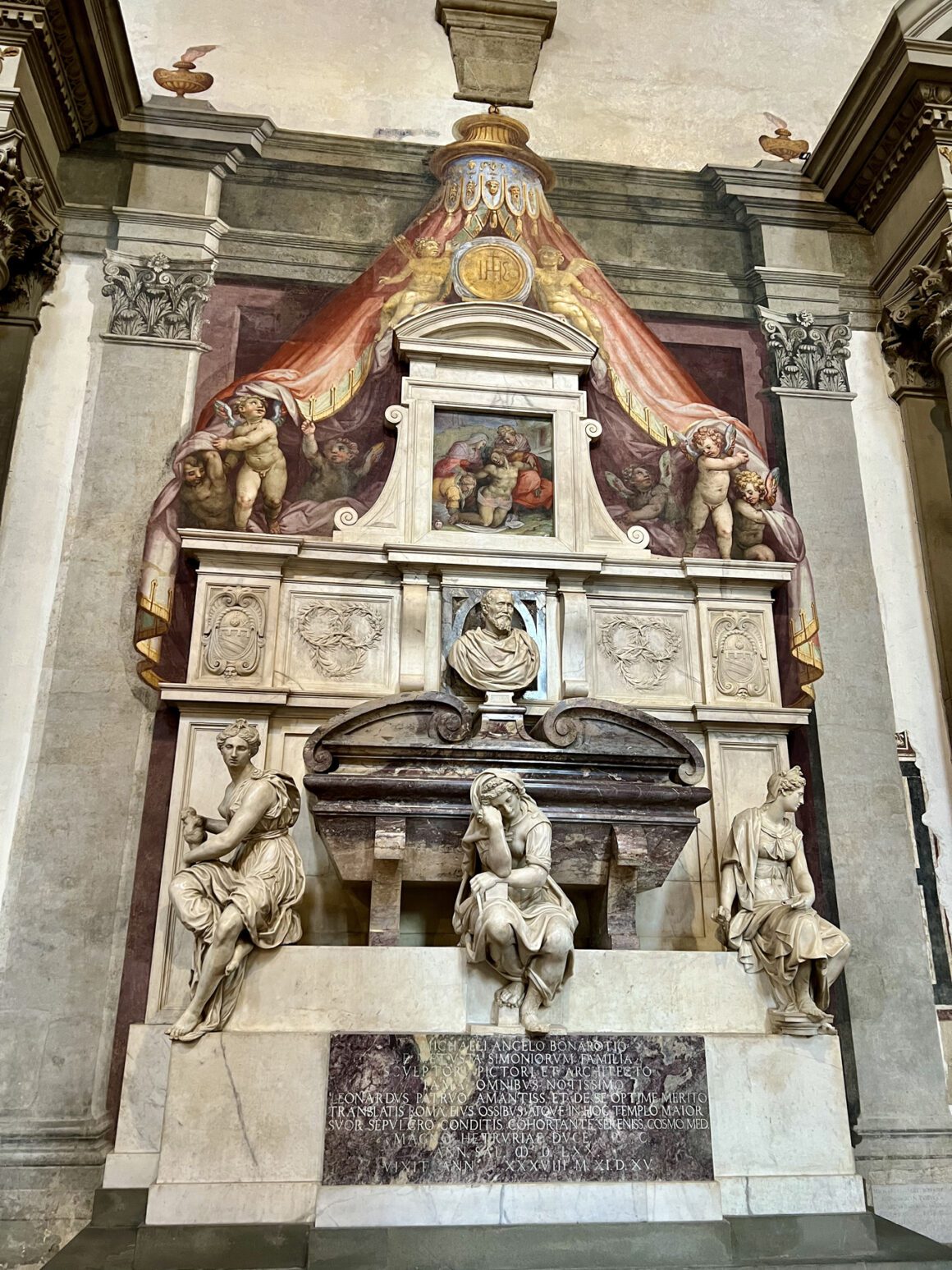 The Medici Chapels are a vast complex of chapels of great historical and architectural interest. The large crypt, which holds the tombs of the Medici family, was built following a design by Buontalenti. The underground chambers of the Church of San Lorenzo, restored after the flood, hold the simple and suggestive Tomb of Cosimo the Elder, inserted into the central pillar, and the Tomb of Donatello, whose plaque was placed there during a later period (18th century). Stairs lead up to the Chapel of Princes, the sumptuous mausoleum of the Medici grand dukes, begun by Matteo Nigetti in 1604 following a design by Don Giovanni de’ Medici, the natural son of Cosimo I.