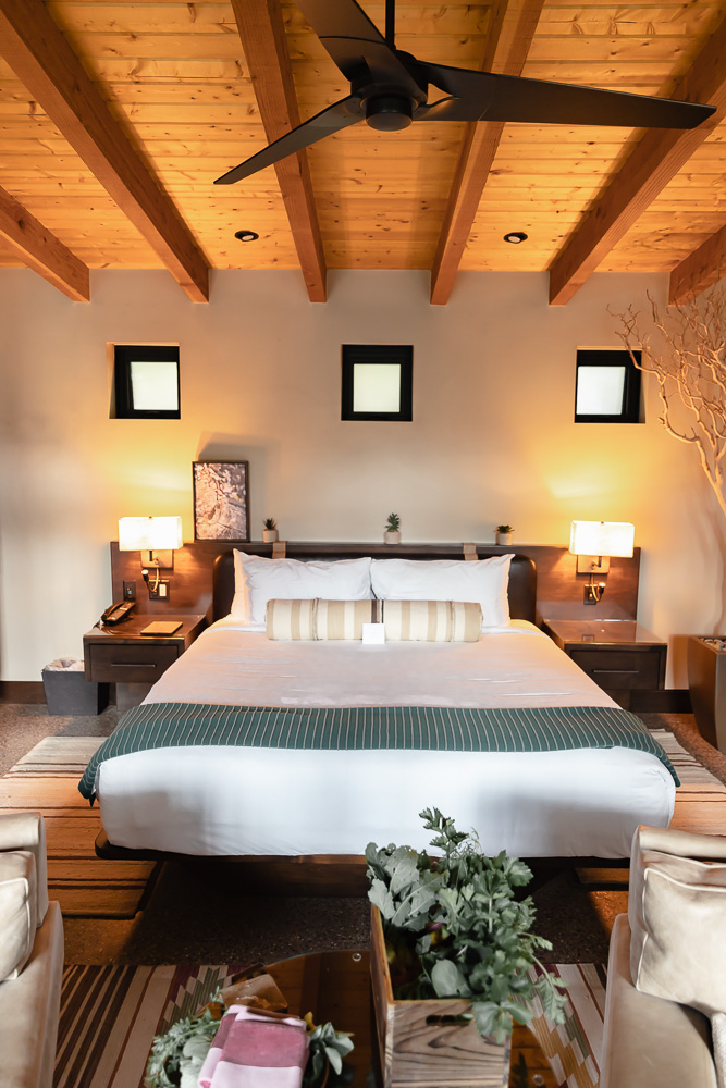 Our Spring Bungalow had a spacious, outdoor covered deck, and indoor/outdoor gas fireplaces. The interiors are lovely with wood beamed ceilings, leather furniture and woven rugs with colors inspired by the rocks surrounding the hot springs: moss green, ochre, and copper. There is an open air room off the bath with a soaking tub fed by waters from the natural spring. In fact, you will find that the springs provide all of the water for the resort, from drinking water to irrigation for the farm.