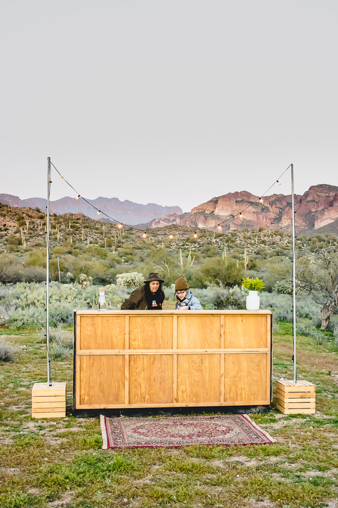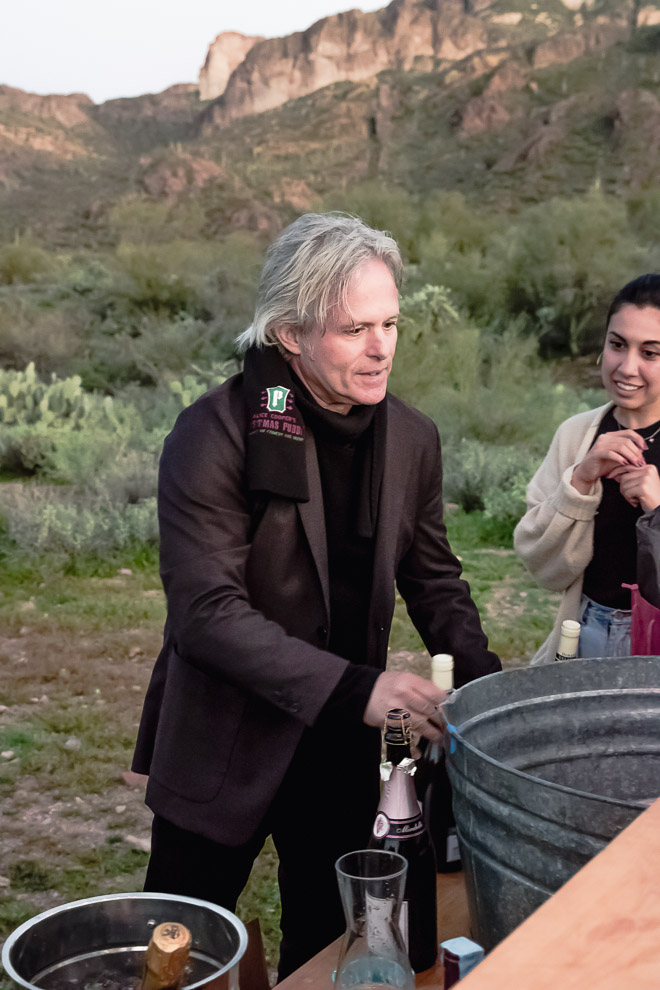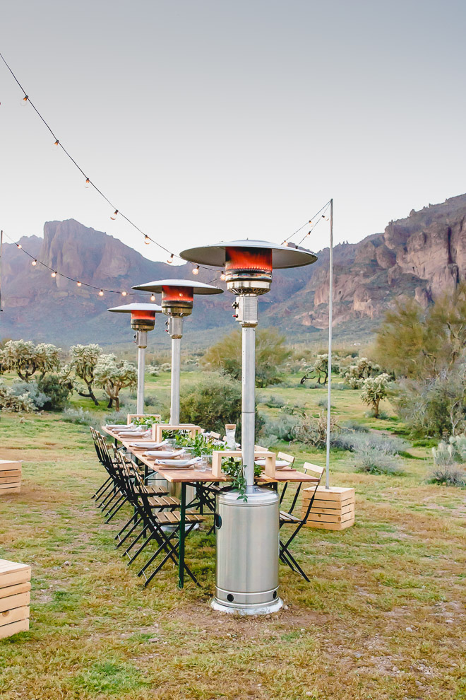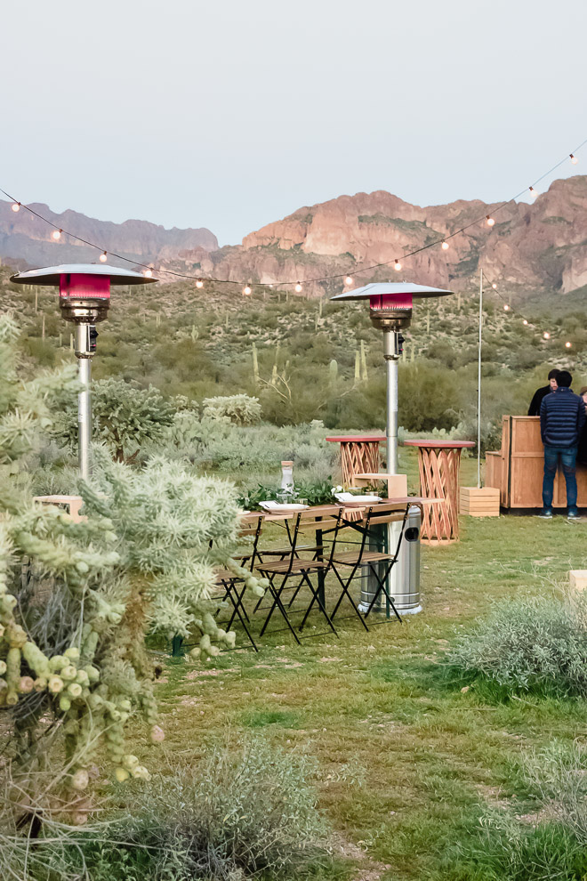 Last spring at our school auction, Hubby and I, along with some friends, bought a desert dining experience with a local company, Cloth & Flame. As a result of following their Instagram page, I had been fascinated by the idea gourmet dining in the desert under the stars in the company of great friends. When the appointed date rolled around, sixteen of us were picked up at 5 pm in Paradise Valley, battled traffic for about an hour, before arriving just before sunset at the base of the Superstition Mountains. As we rolled out of the van, the setting laid before us was nothing short of awesome.