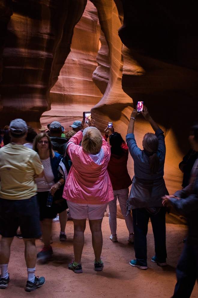You may have heard about the most expensive photo ever sold by photographer Peter Lik. Lik’s black and white photograph called Phantom sold for $6.5 million in 2014. It features a shaft of light coming down into the canyon that appears to depict a ghost-like figure from dust particles in the air. Since then, the popularity of Antelope Canyon has soared. We did not get one of the iconic photos of the light shaft coming down through the canyon, as that occurs around noon when the sun is directly above. Rather, we had scheduled our tour for 7 am to avoid the following scene:
