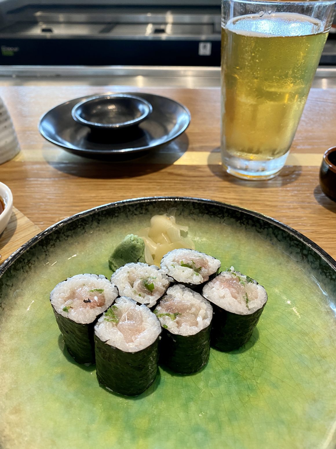 I was excited to try this sushi restaurant from HL Concepts, the group behind Sizzle Korean BBQ. Nori Sushi offers happy hour Monday thru Friday from 3-6 pm. Drink and food specials are very reasonably priced from $3 – $6. I ordered an Asahi draft beer with a shot of sake for $5 to accompany the Yellowtail Maki roll and Shrimp Tempura appetizers, each for $5. My total was $10.86 with tax.