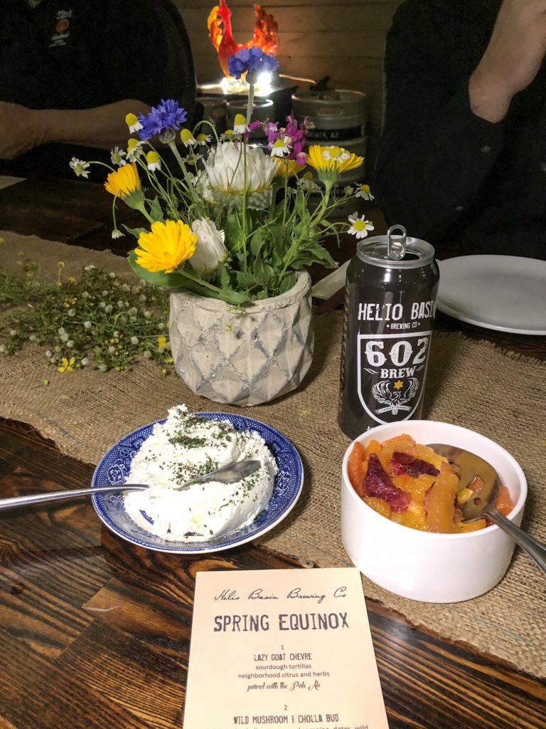 Helio Basin Brewing Company owners, Mike Conley and Dustin Hazer, bring something unique to the Arizona dining scene. In their mission to raise awareness for Arizona beer and cuisine, they have found a partner in Chef Tamara Stanger, a Utah native with a passion for Arizona. Supporting local farms and small businesses, the team at Helio Basin has created a menu decidedly Arizona-centric. What does this mean? Some have described the cuisine as Native American. And one can certainly argue that it contains Native American elements, such as the O’odham White Tepary Bean Purée. However, I feel it’s more than that. I am reminded of an episode I watched from the Netflix show, Chef’s Table, about Magnus Nilsson, chef and owner of Fäviken in Sweden, who forages the subarctic for ingredients at his Michelin two-star restaurant. To quote Chef Nilsson, “If you have everything all the time, there is very little motivation to create something new, and possibly better.” Like Magnus Nilsson, Chef Stanger’s preparations draw on her knowledge in foraging in a challenging environment. At a recent Spring Equinox Dinner at Helio Basin, Chef Stanger celebrated spring as one of her favorite times to forage with the desert in full bloom. Each course was paired with a Helio Basin beer that highlighted the flavors in each dish. It was an eye opening experience, to see how Chef Stanger forages from the bounty of the desert to bring exceptionally fresh ideas to the table. Bon Appétit! xoM