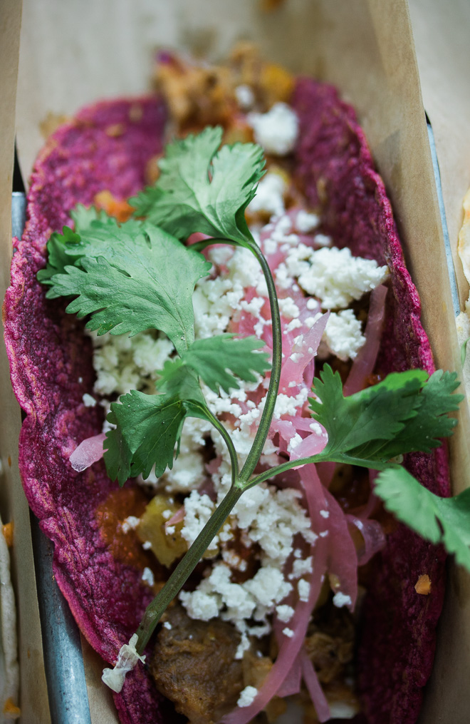 Billed as a trendy, new age taqueria that’s a favorite of the post-bar crowd, Velvet Taco should make a taco purist like me go running in the opposite direction, as it is anything but traditional. Chef John Franke produces a wide variety of tacos such as the Spicy Chicken Tikka taco, the Falafel taco and the Cuban Pig Taco. I am not sure how I found myself here, as I don’t consider myself trendy, or new age, and I am usually in bed by 10 pm. But my daughter and I were hungry and craving tacos (shocker), so I walked into it without expectations. The red curry coconut queso we ordered to keep us occupied while we were waiting for the main event was such a lovely surprise. I won’t be able to do this justice, but it reminded me of the Velveeta queso I ate as a kid blended with a Thai soup, like Tom Yum Gai. I am going to return this weekend to taste it again so I can try to replicate it at home. I was also in awe of the colorful tortillas made with hibiscus pictured below.