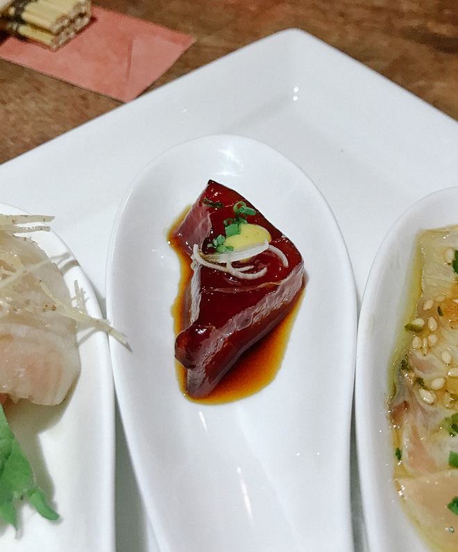 Big eye tuna in fermented soy bean sauce, a flavor that reminds me of Japan.