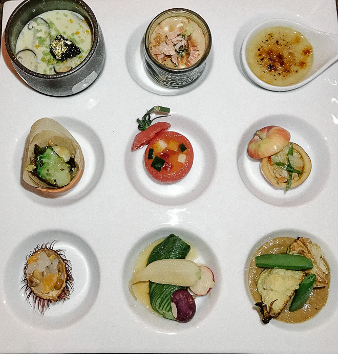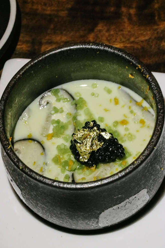 Top Row (L to R): Chilled egg custard, also known as chawanmushi, with shrimp meat, topped with yuzu zest, osetra caviar and a touch of gold leaf.