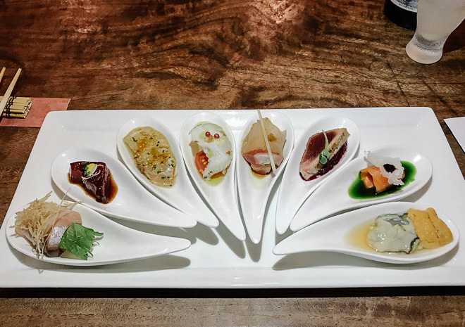 For the second course, we were treated to another group of small bites, this time of sashimi. We were told to start right and end left, and to try everything in between in no specific order.