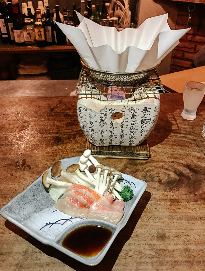 Shabu Shabu is a Japanese hotpot dish where one cooks meat, fish and vegetables in a lightly seasoned broth. There was a small bowl of parchment paper with a lovely broth seasoned by kelp and tea-smoked chicken feet that we used to cook some line-caught kinmedai (golden eye snapper). We also had Napa cabbage, mushrooms, and daikon radishes for “shabu-ing”, plus some ponzu sauce for dipping. Nobuo instructed us to cook the meat ever so slightly, so as to eat when the exterior is warm but the inside is a tad still raw. Once the meat and vegetables were gone, Nobuo poured the broth into a soup bowl with clams and mitzuba (Japanese parsley).