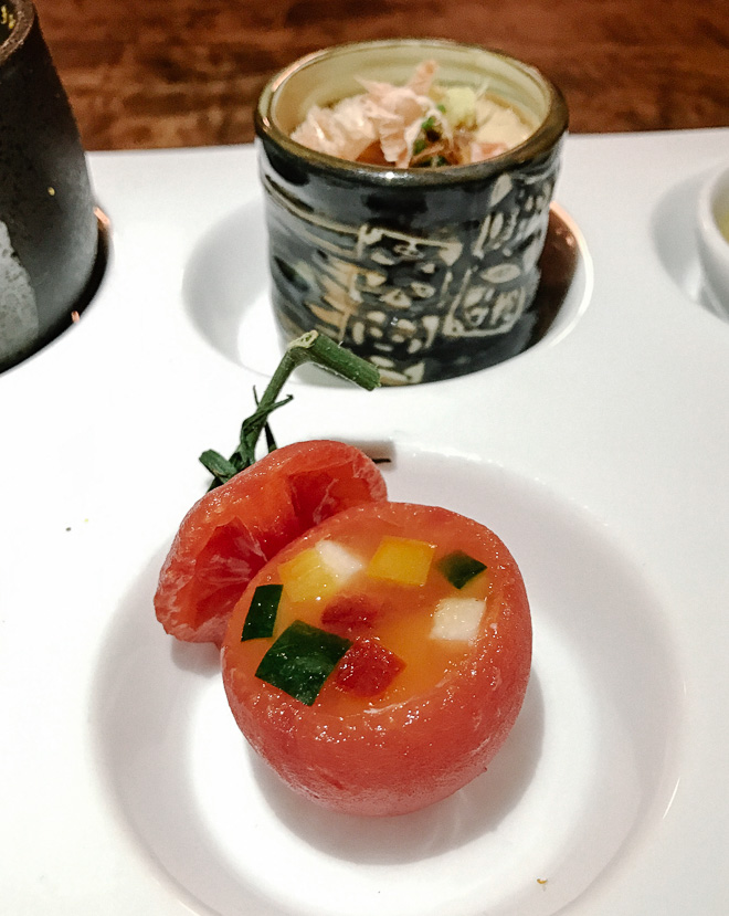 Campari tomato (poached) with peppers and Japanese mountain potato, in a tomato gelée.
