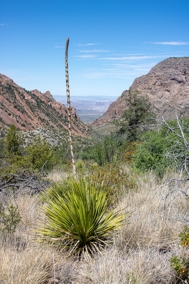 The landscape in and around the park reminded us of Arizona, with octotillo cacti and desert brush, colors of sage, brown and grey completing the scenery. Our destination was the Chisos Basin which rises above the Chihuahuan desert floor at 5,400 feet. The road has sharp curves and steep grades and not recommended for trailers longer than 20 feet and RV’s longer than 24. Or for people who get violently car sick, for that matter.