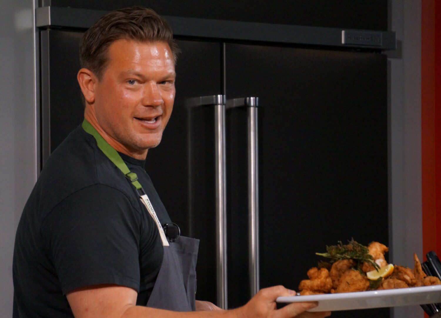 Why does it feel like most of the dishes prepared for audiences at the Aspen Food & Wine Classic involve poultry? Maybe it is a dish to which everyone can relate? You know when you are trying something new and exotic, like iguana or crocodile, you are invariably told, “It tastes like chicken!”. At any rate, you may find Tyler Florence’s take on chicken to be a new one for you. Tyler Florence, accomplished cookbook author, chef and restauranteur, has been on television for close to twenty years. He looks so young, you will find that hard to believe. Most recently, he hosts some of my favorites shows, such as The Great Food Truck Race, and Worst Cooks in America. He has published about 10 cookbooks, including Tyler Florence Fresh and Inside The Test Kitchen, bottles his own wine, and plans to roll out an app for recipes and food photography.