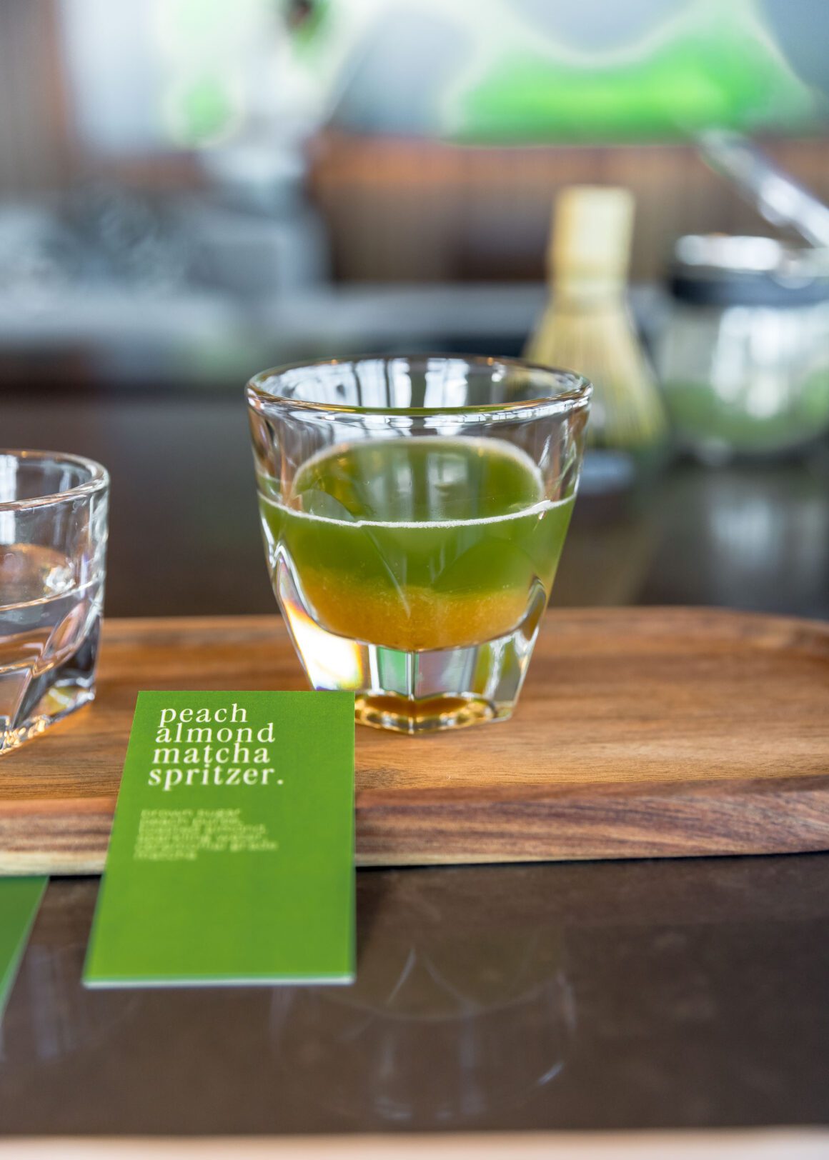 Peach Almond Matcha Spritzer – Brown sugar peach purée and toasted almond with sparkling water, finished with matcha. Effervescent and layered, it’s a playful twist on fruit-and-tea pairings.